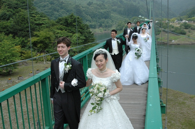 320mという日本有数の歩行吊橋をバージンロードに見立て、 さわやかな空と新緑と水(ダム湖)に囲まれた会場で、カップルの門出をお祝いしています。