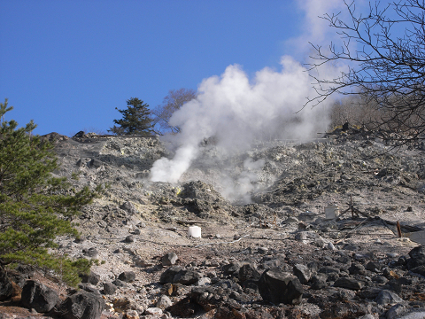 源泉遺産、近くの噴煙上がる硫黄山より