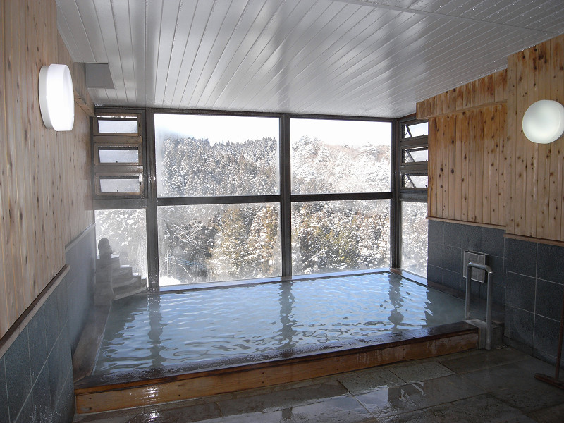 雪化粧の山々を一望出来る展望大浴場は24時間入浴可。