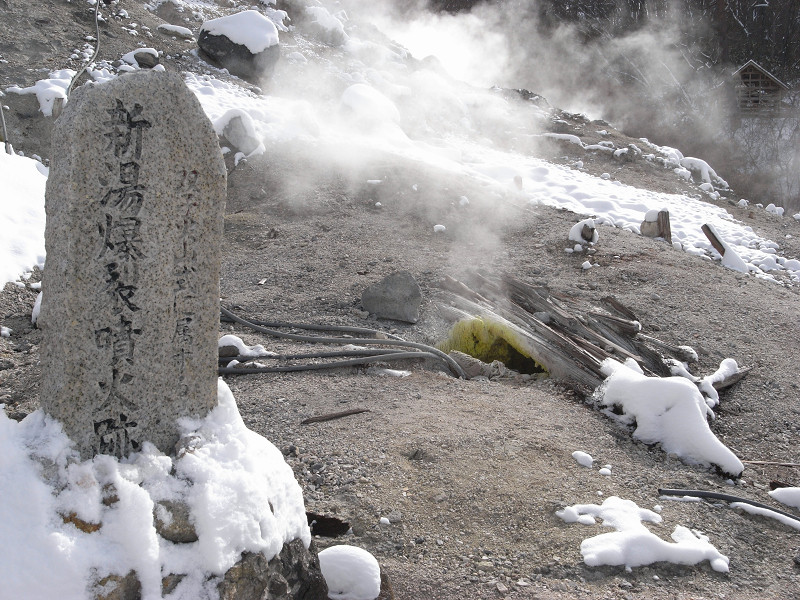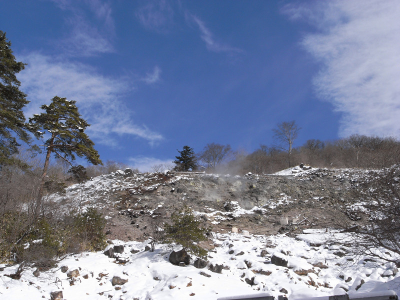 当館の源泉、噴煙が上がり、にごり湯沸く硫黄山からの源泉そのまま掛け流しです。(当館より徒歩1分、見学できます。)